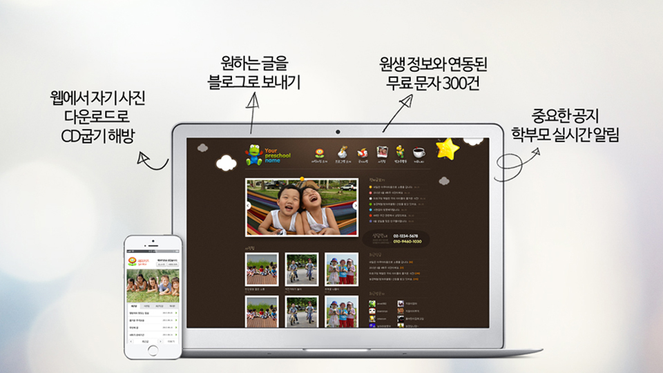 웹사이트에는 원생별로 분류된 사진이 올라가고 이를 원/반별/개인별로 공개할 수 있습니다.