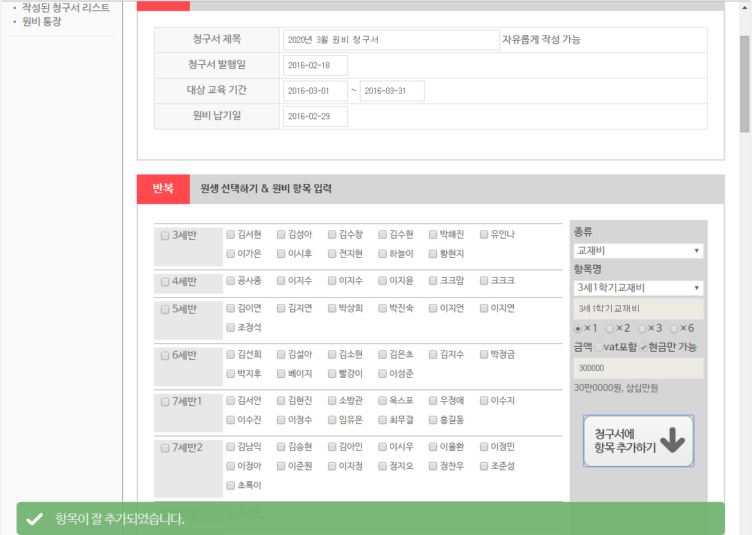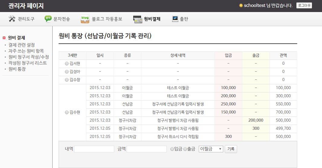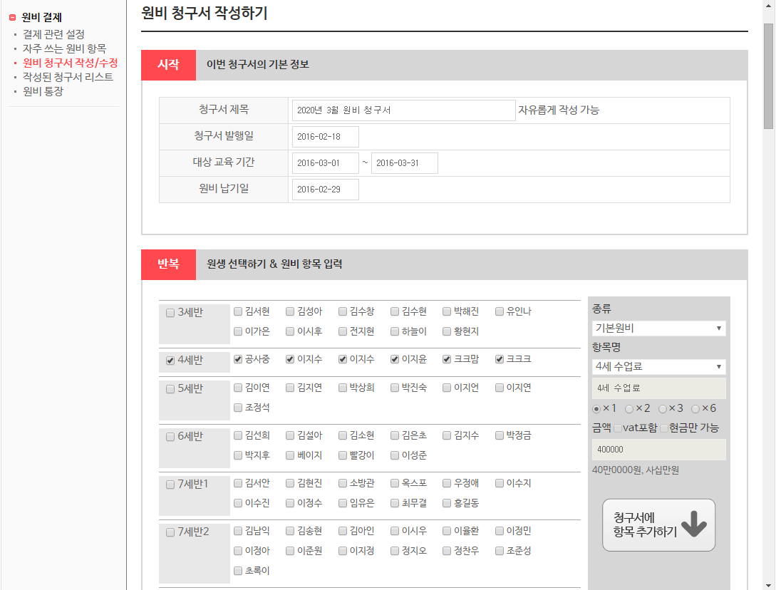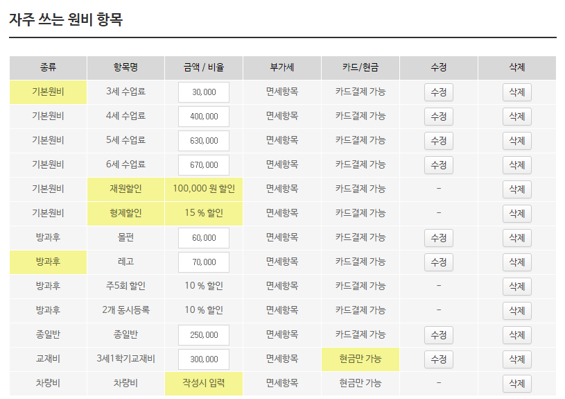 원비의 종류는 물론이고, 일반/할인, 현금전용 등의 입력이 가능합니다.