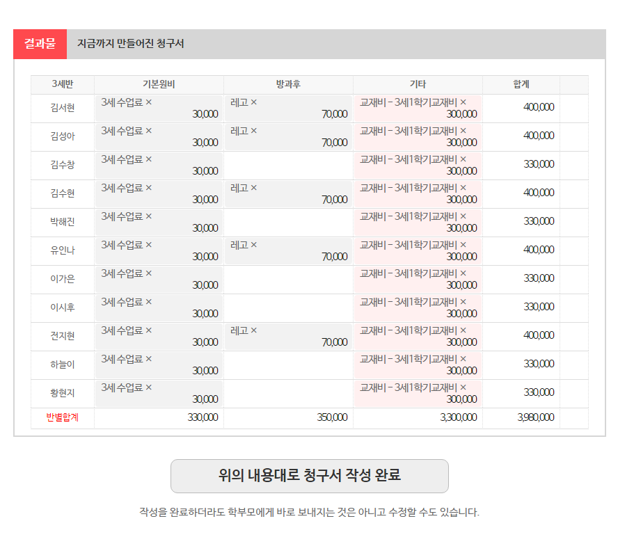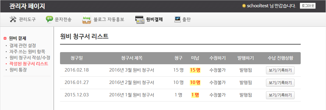 청구서별로 미납 원생수가 표시됩니다.발행하지 않은 청구서는 수정이 가능합니다.