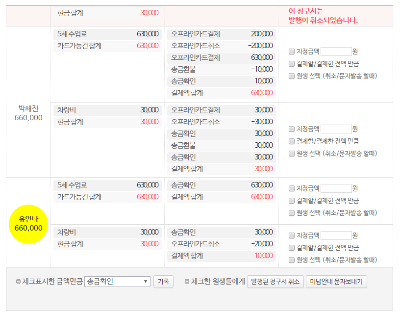 원생별,반별,원전체 합계가 나옵니다. 현금전용 항목은 핑크로 나타납니다.