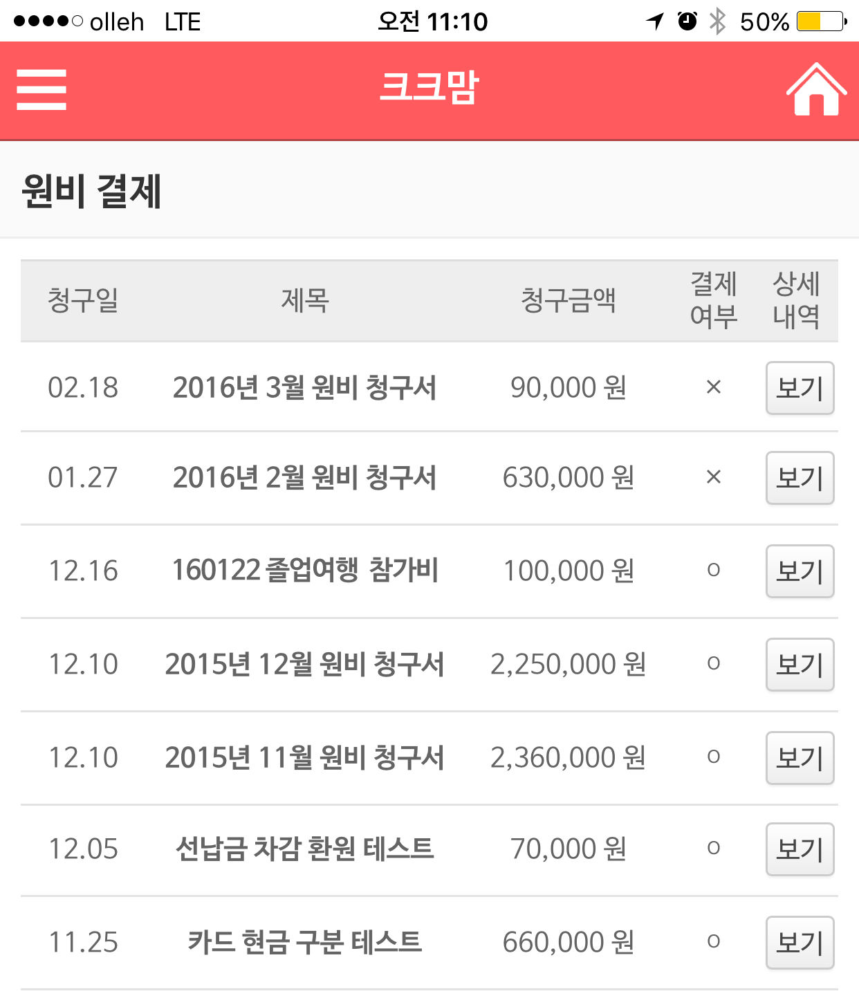 미납금액이 있으면 노란색 표시가 나옵니다.