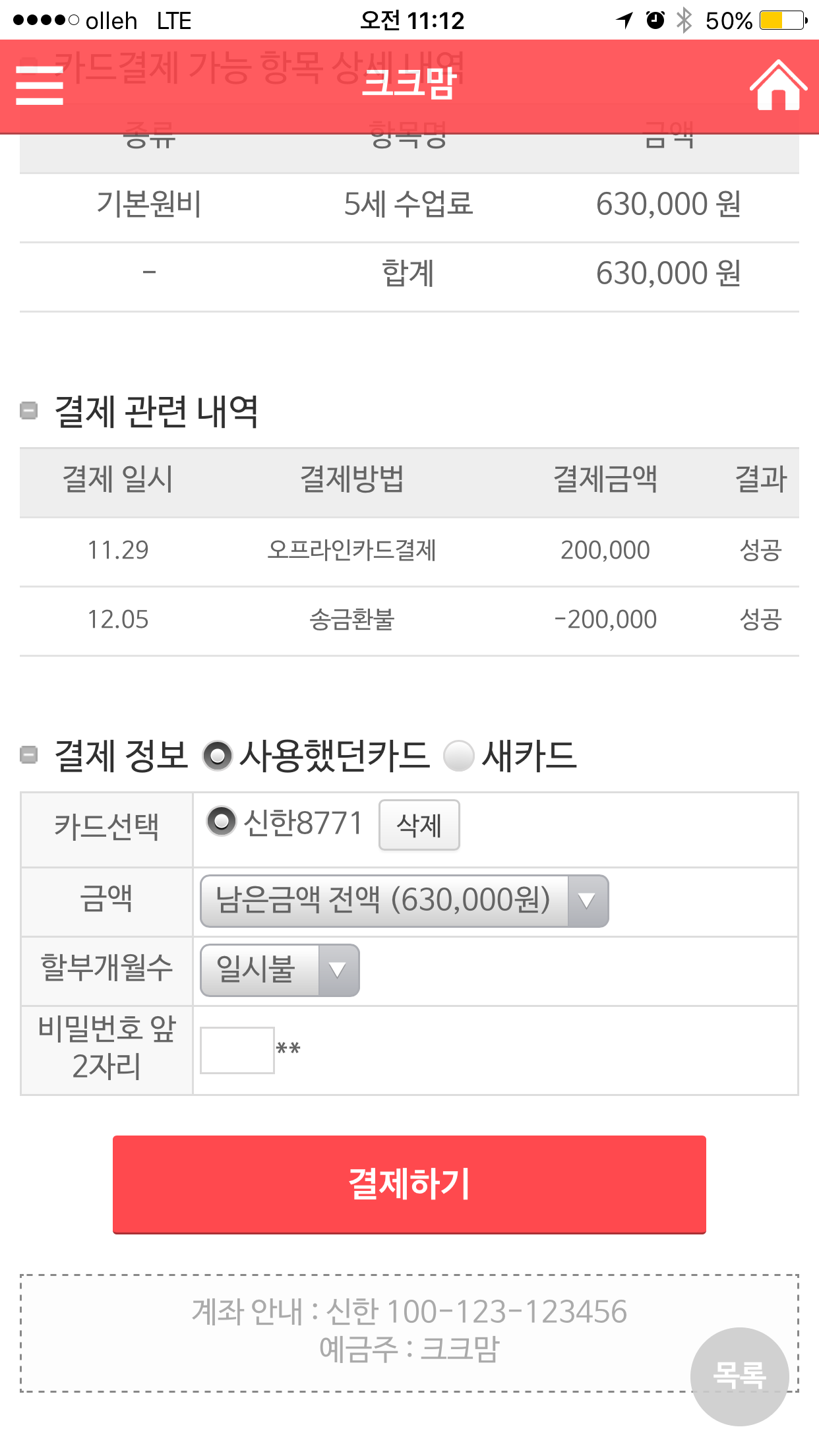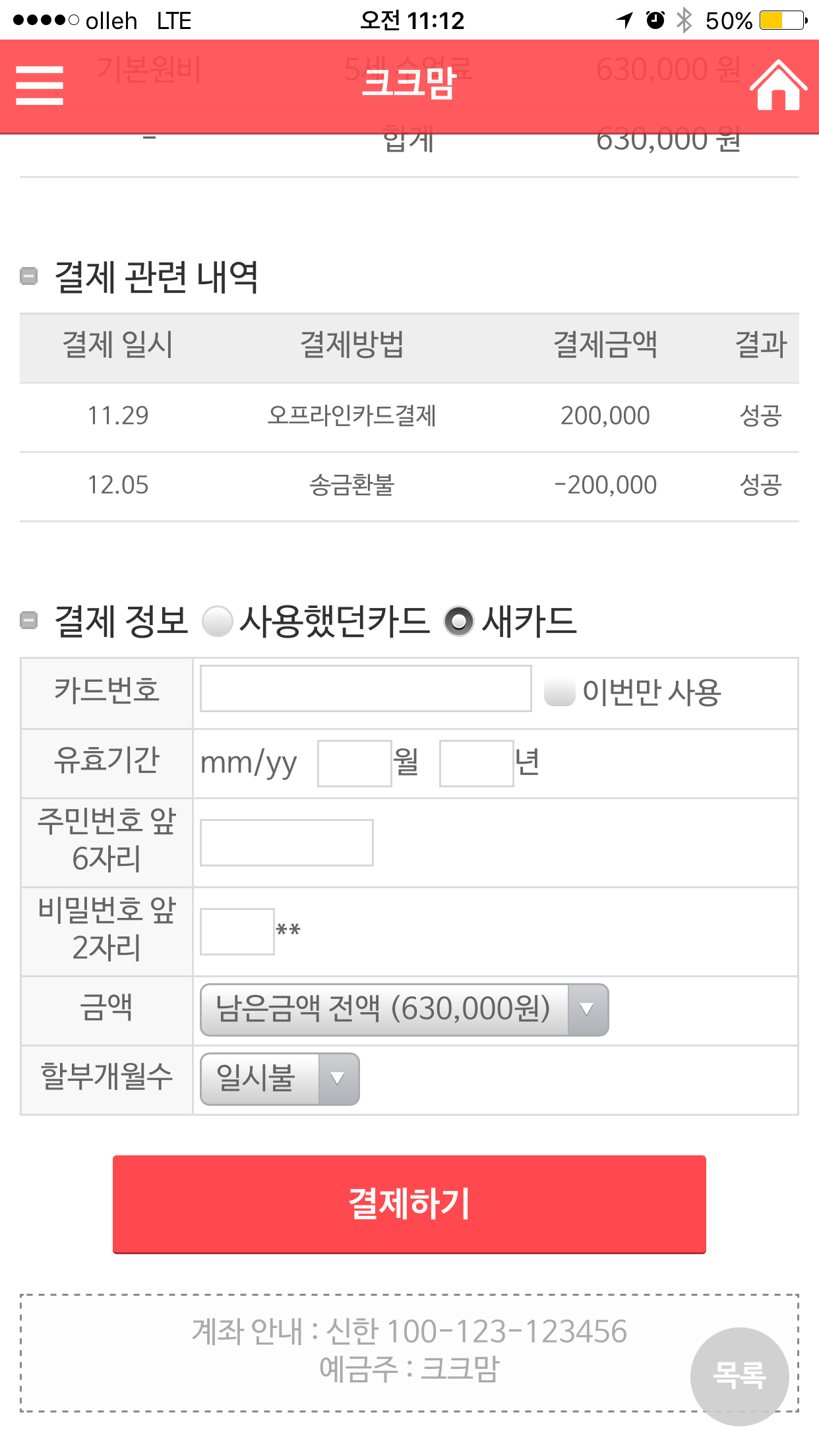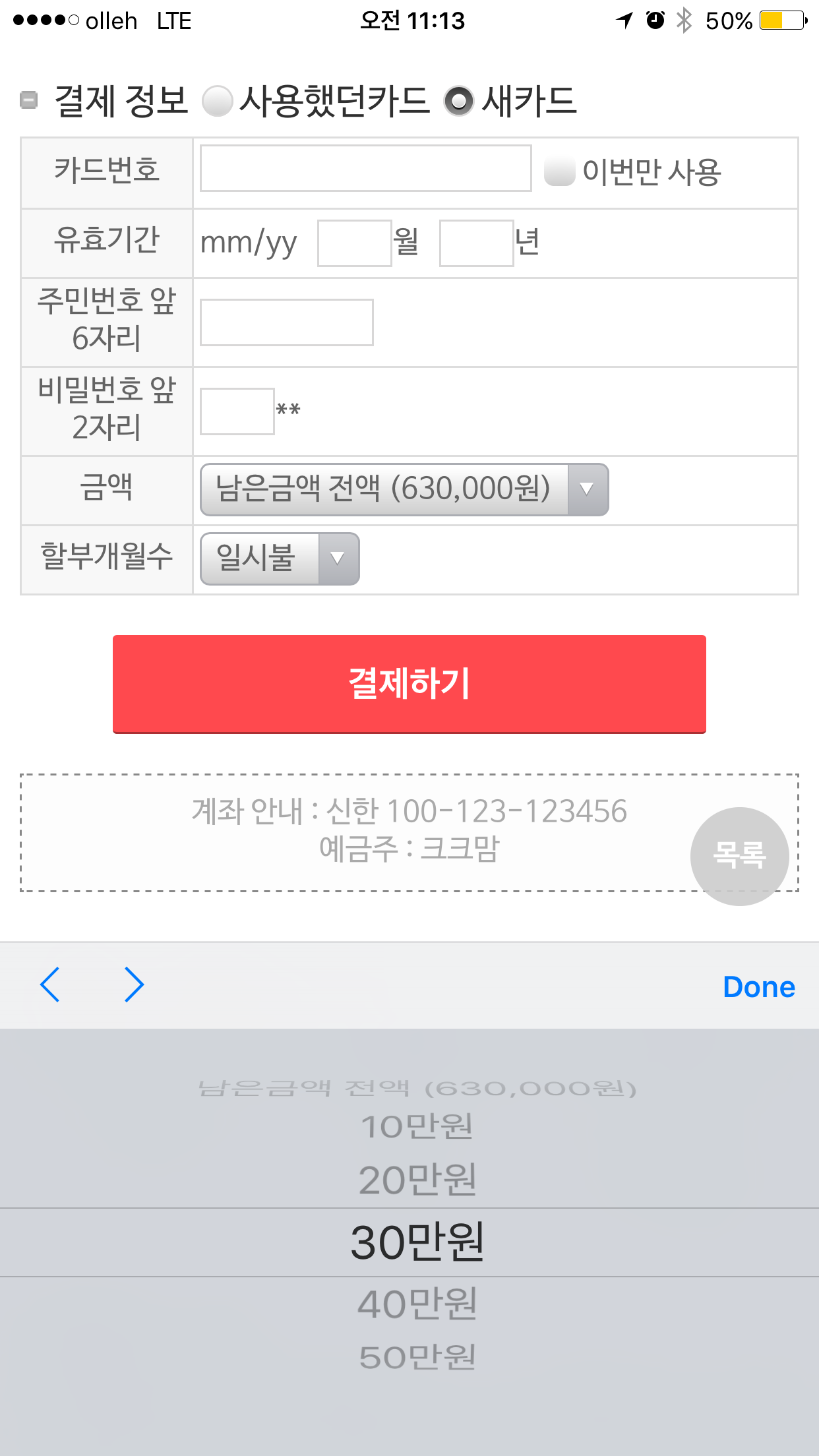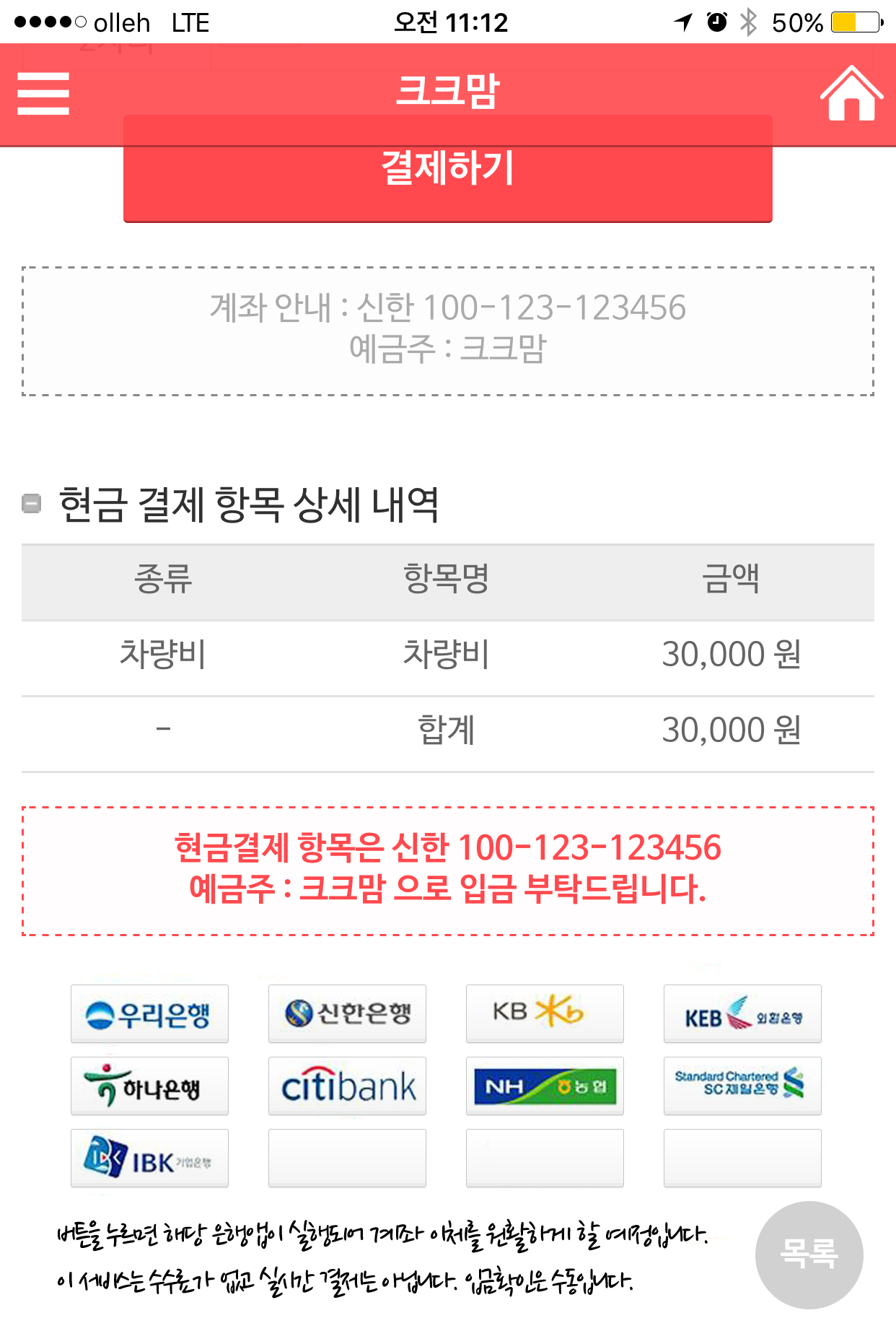 현금결제 항목 하단에는 계좌번호 안내가 나갑니다.